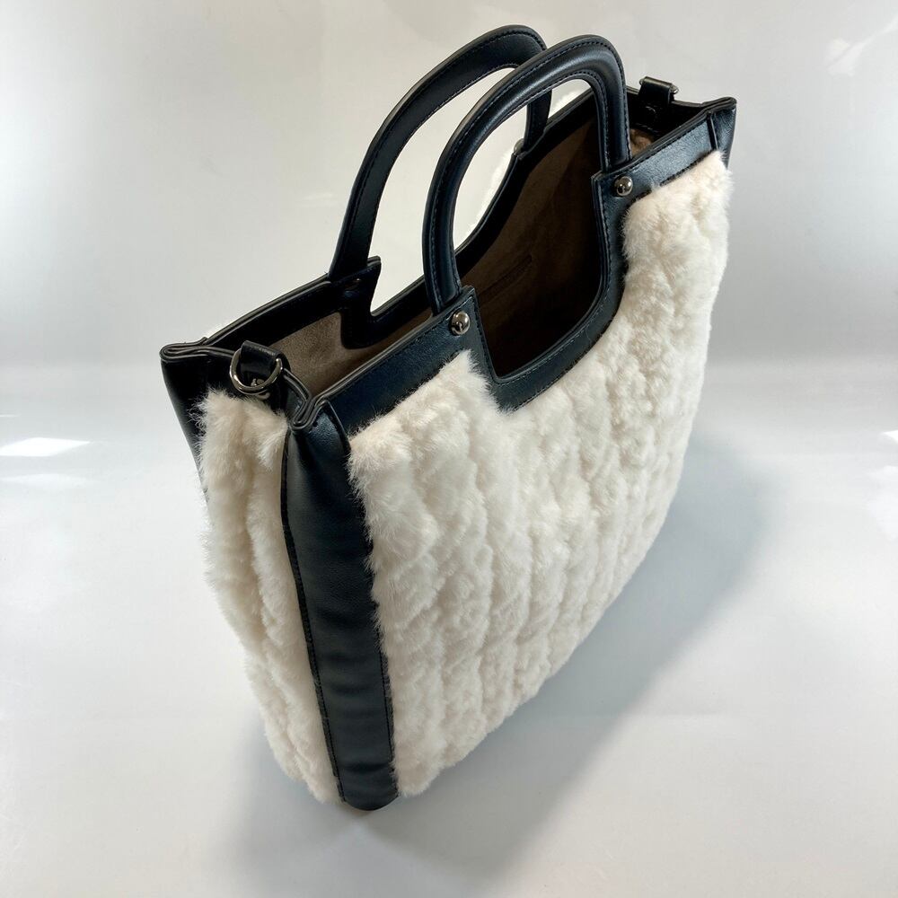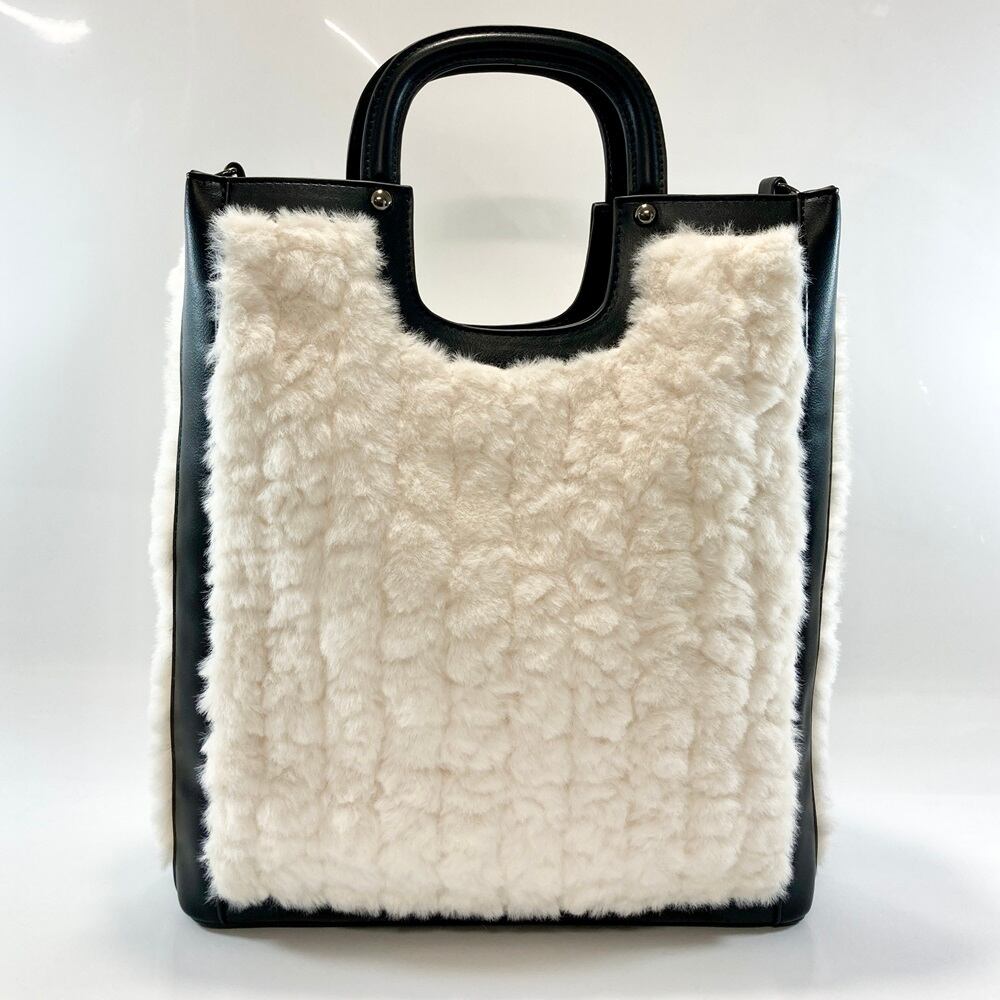 表面感のあるエコファー素材を使用したトートバッグ。少しスクエア―なデザインのくり手がデザインポイント。スクエアな本体フォルムも使い勝手も良く、お洒落なファーバッグに仕上げています。ショルダー付き。サイズは幅28㎝ 高さ33cm マチ8cm。本体素材はフェイクファーと合成皮革。生産は中国です。