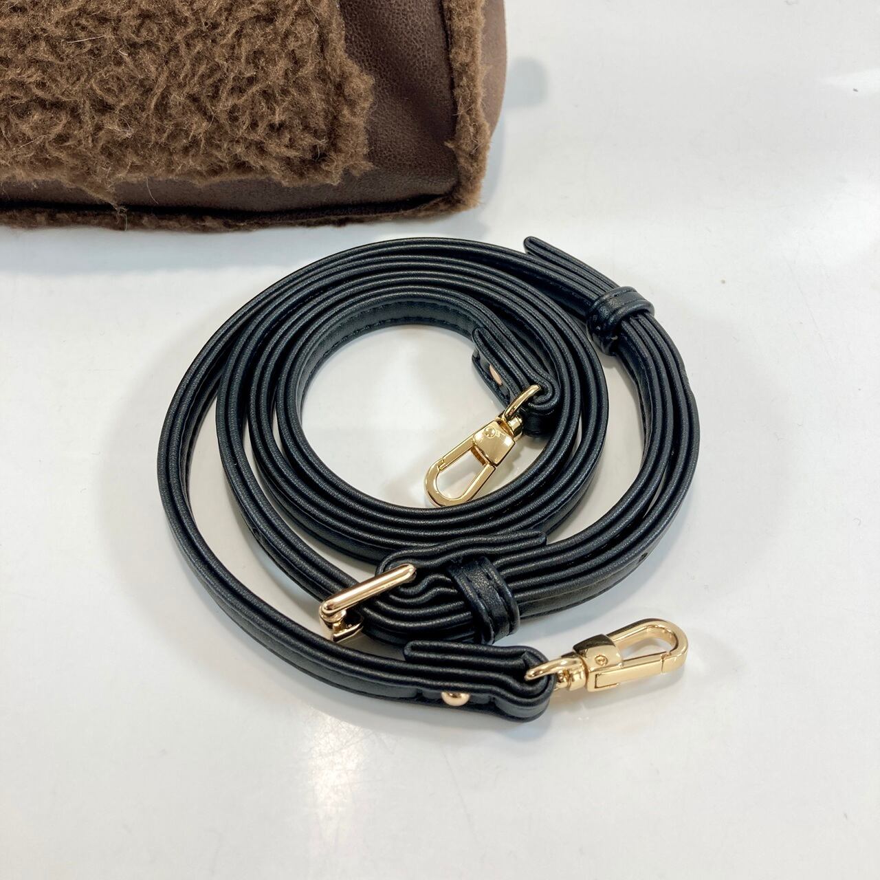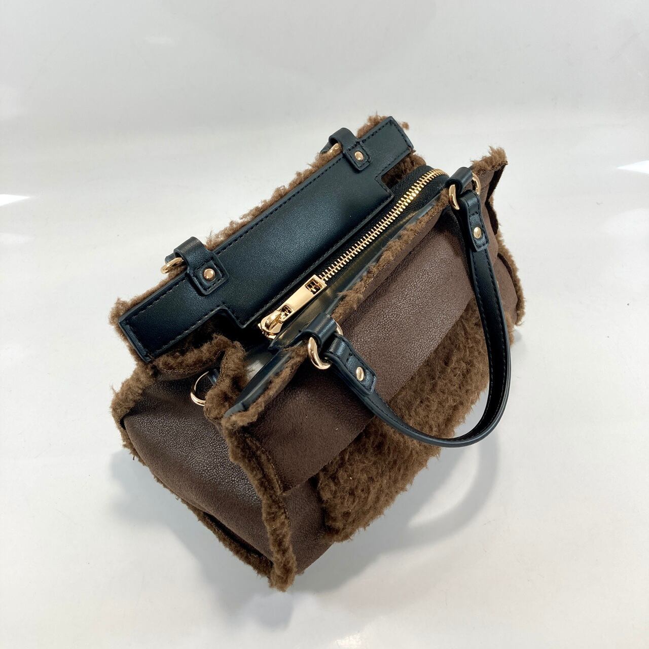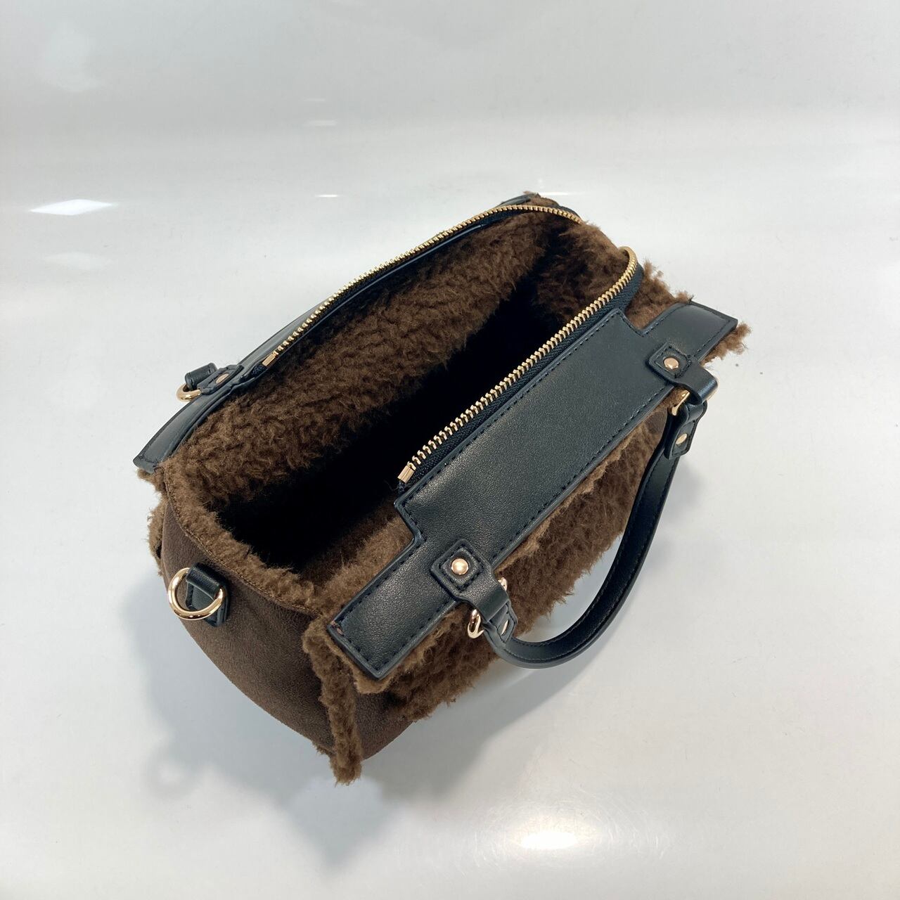 フェイクムートン素材を使用した、可愛らしいミニバッグです。柔らかなフェイクムートンと合成皮革の組み合わせが、温かみとスタイリッシュさを演出します。サイズは幅20cm、高さ16cm、マチ12cmとコンパクトで、普段使いのお供にもぴったりです。持ち運びしやすく、コーディネートに華を添える一品です。ショルダー付き。生産は中国です。
