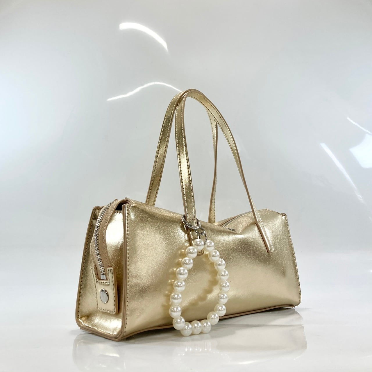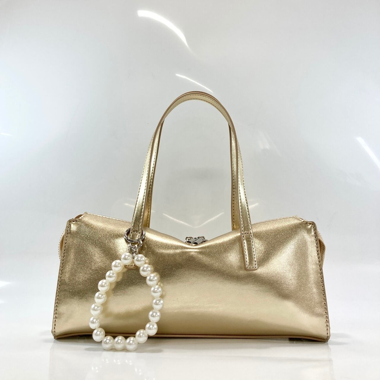 エレガントなメタリックカラーが魅力のスクエアバッグです。トレンドの横長のデザインで、幅28cm、高さ13cm、マチ8cmの使いやすいサイズ感が特徴です。洗練されたスタイルが、カジュアルな装いにはもちろん、特別なお出掛けにもぴったり。さらにパールのチャームが付いており、バッグ全体に高級感を演出します。年末年始のお出掛けにも、日常使いでもお洒落に決まるアイテムです。素材は合成皮革。生産は中国です。