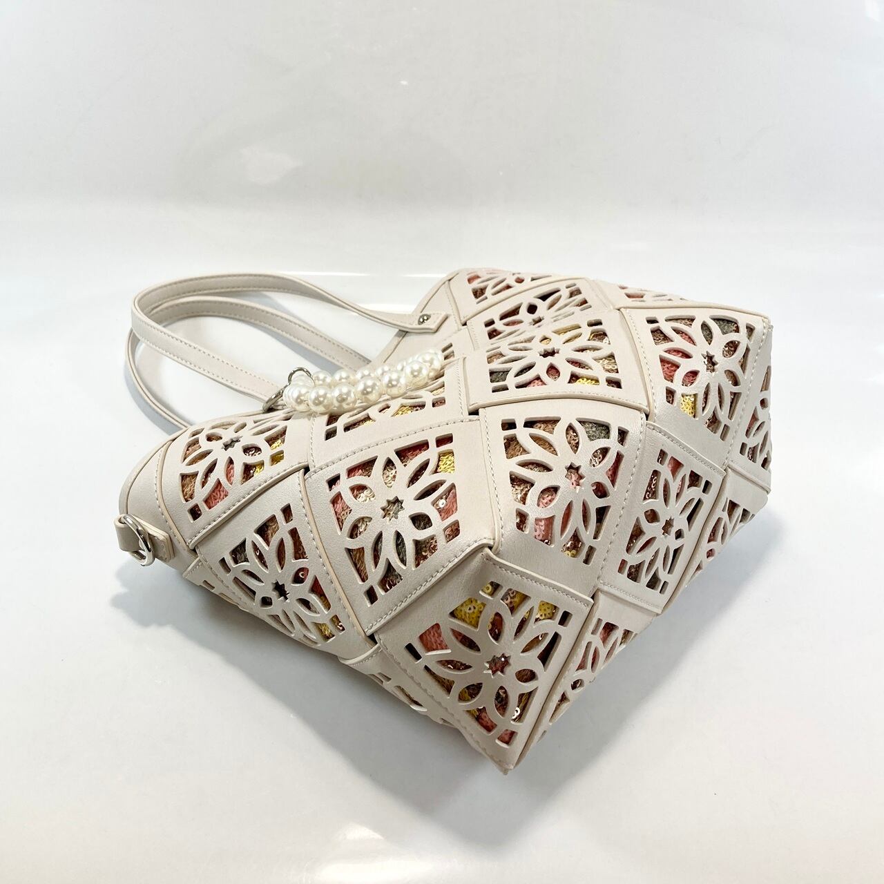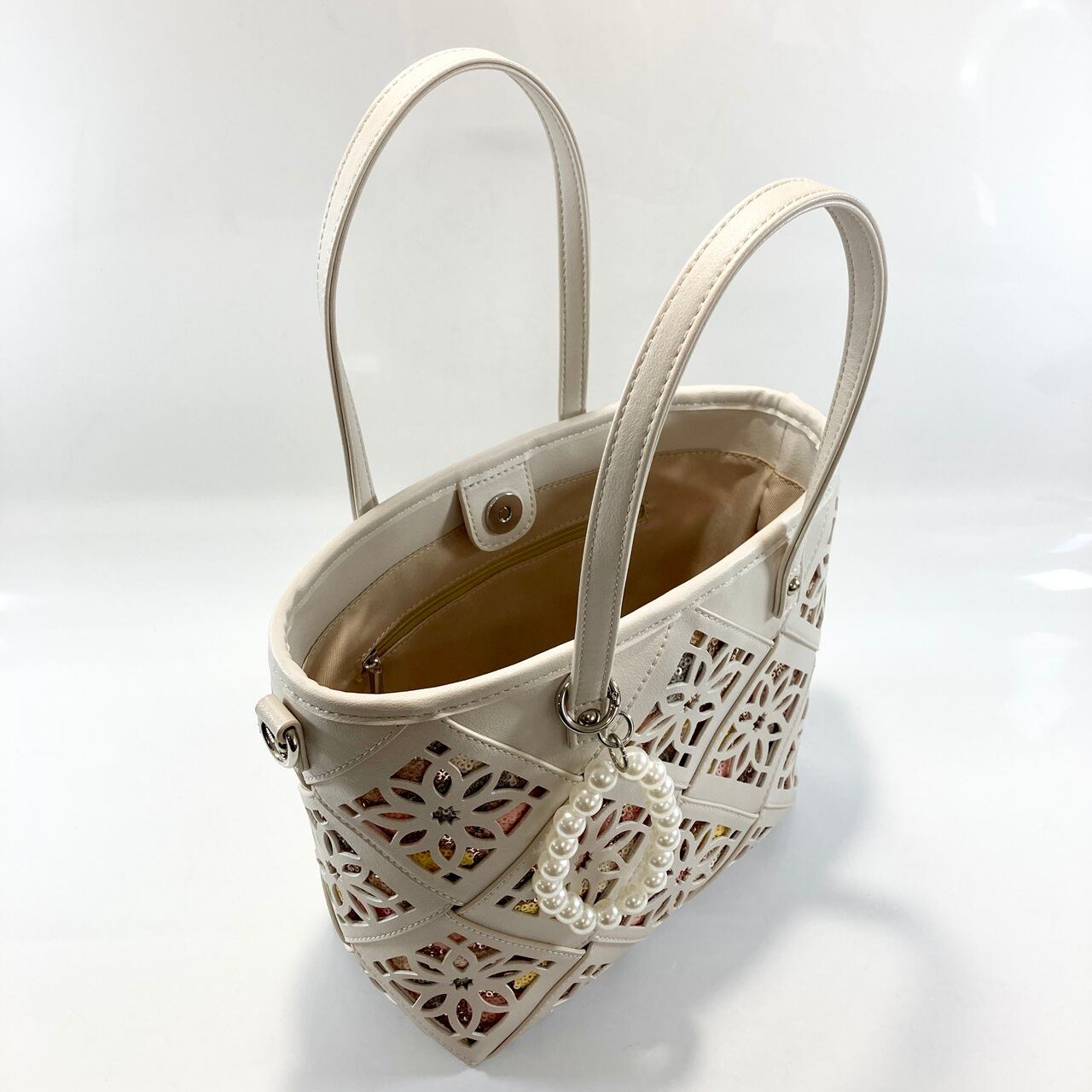 幅広のメッシュひもにパンチング加工を施した、お洒落なデザイントートバッグです。パンチングの隙間から覗く花柄スパンコールが、さりげないアクセントとして魅力を引き立てています。サイズは幅21cm、高さ21cm、マチ10cmで、デイリーユースから特別なシーンまで幅広く活躍するアイテムです。生産は中国です。長さ調節可能なショルダーと、お洒落なパーツチャーム付きです。