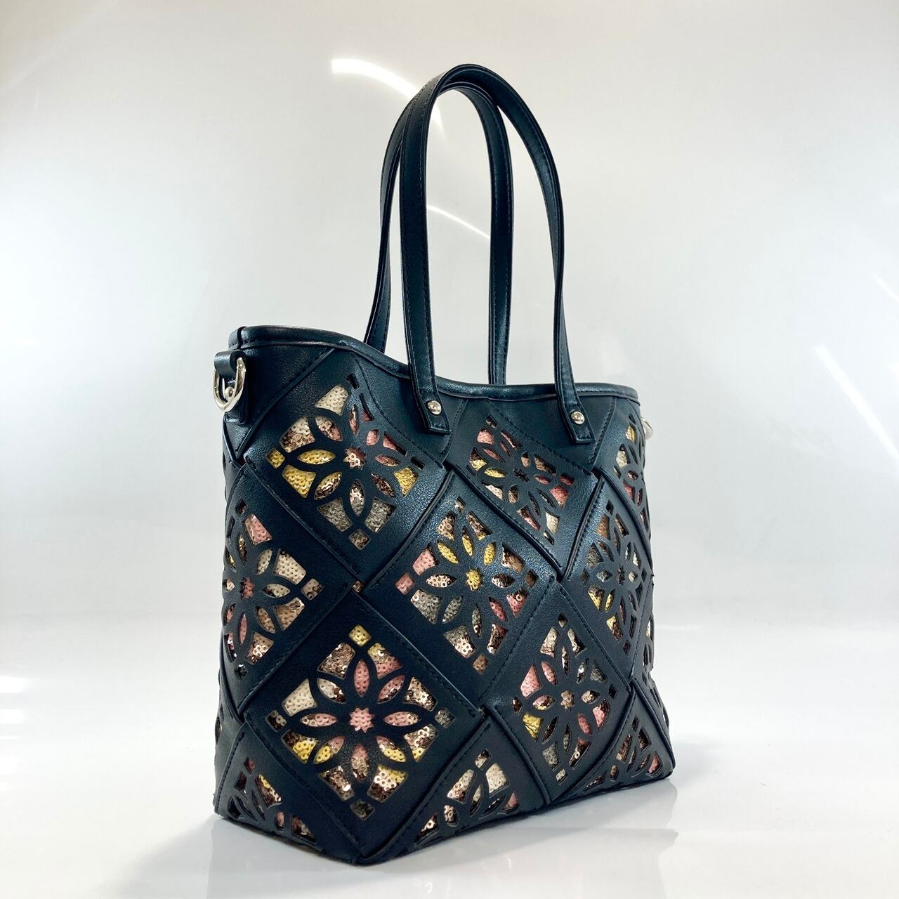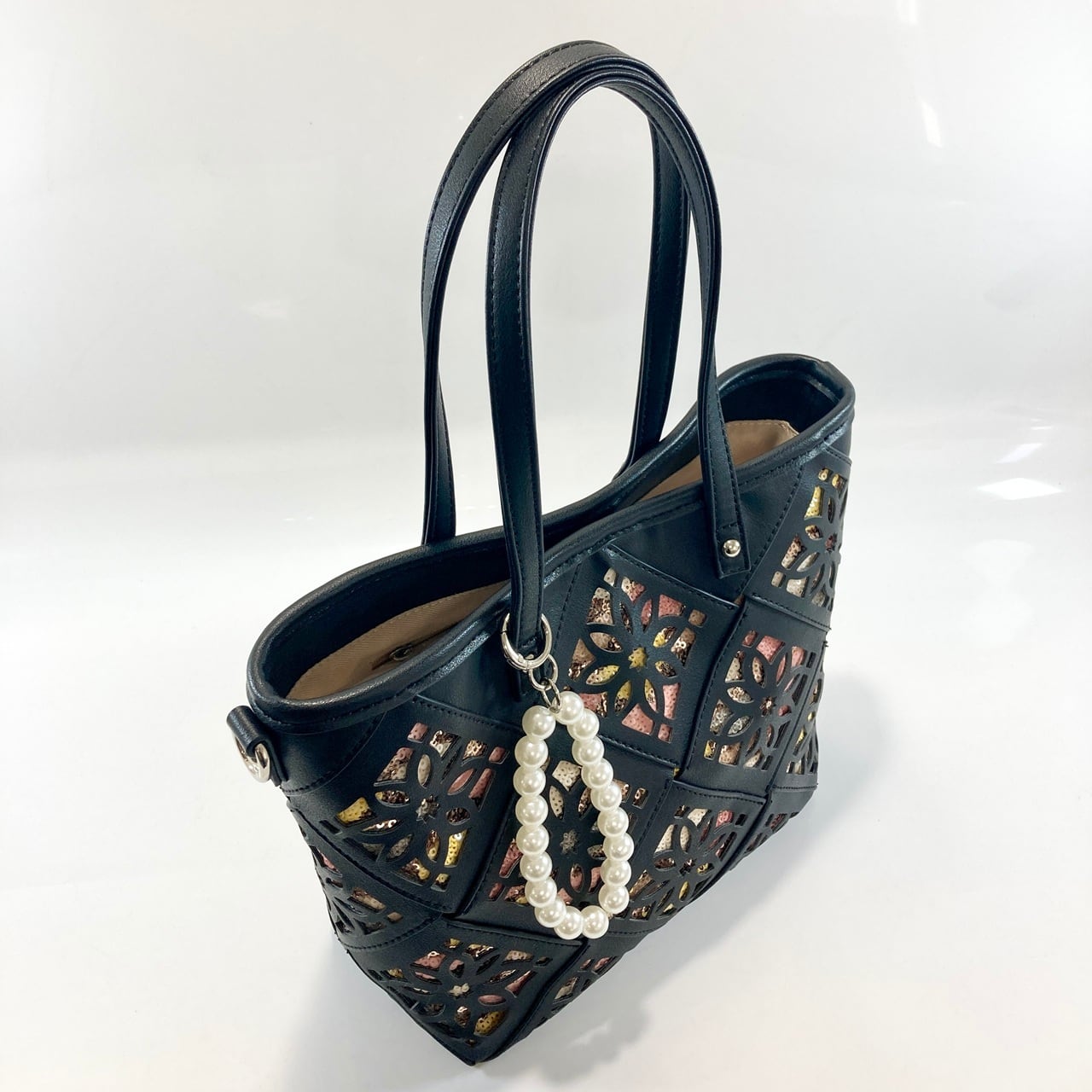幅広のメッシュひもにパンチング加工を施した、お洒落なデザイントートバッグです。パンチングの隙間から覗く花柄スパンコールが、さりげないアクセントとして魅力を引き立てています。サイズは幅21cm、高さ21cm、マチ10cmで、デイリーユースから特別なシーンまで幅広く活躍するアイテムです。生産は中国です。長さ調節可能なショルダーと、お洒落なパーツチャーム付きです。