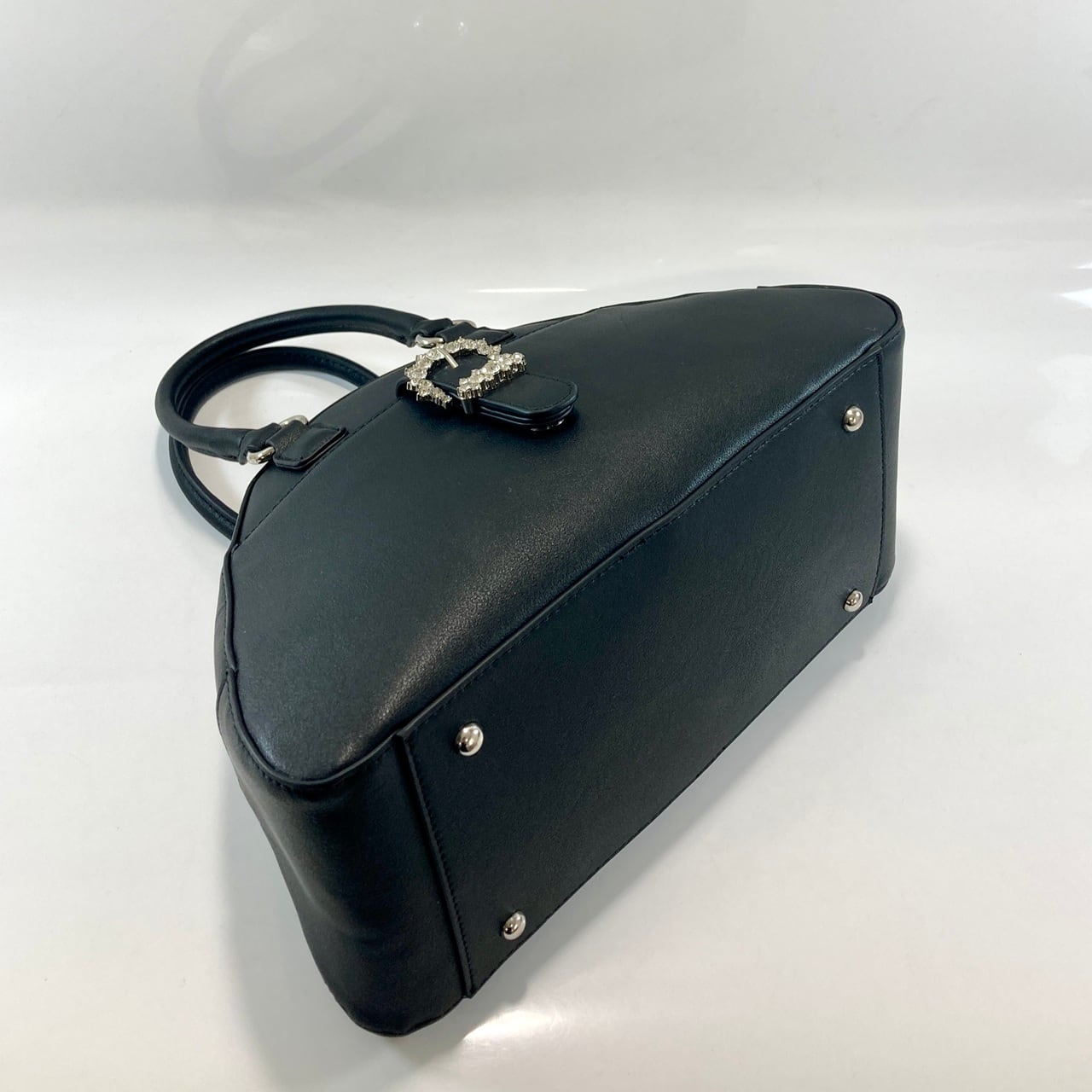 クリスタルバックルがデザインポイントのこのバッグは、丸みをおびたデザインが魅力的で、コーディネートのアクセントにぴったりなアイテムです。シンプルながらも高級感のある見た目は、デイリー使いから特別なシーンまで幅広く活躍します。ショルダー付きで、使い勝手も抜群。サイズは幅30cm、高さ21cm、マチ14cmで、必需品をしっかり収納しつつも、スッキリとした印象を与えます。