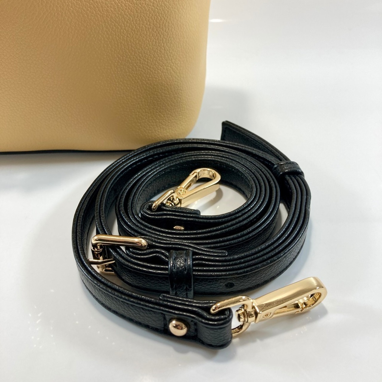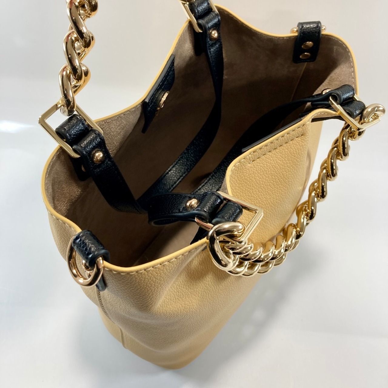 大きめなチェーンのハンドルが、デザインポイント。本体同素材の平ハンドルとの2WAY仕様になります。また斜め掛けできるショルダー付きです。