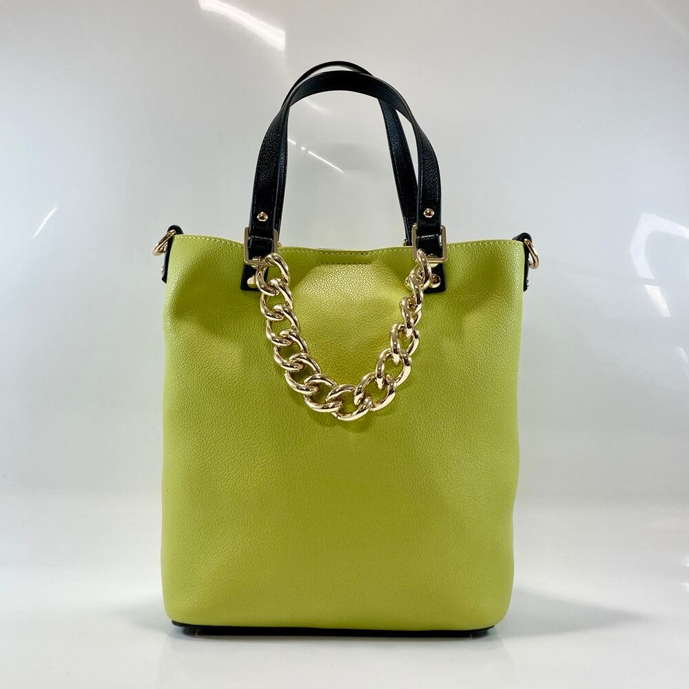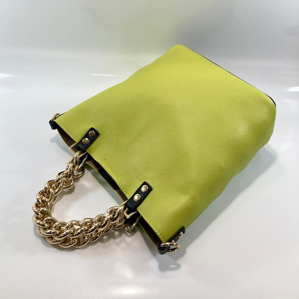 シンプルなデザインで、チェーンハンドルがアクセントになった2WAY仕様のトートバッグ。