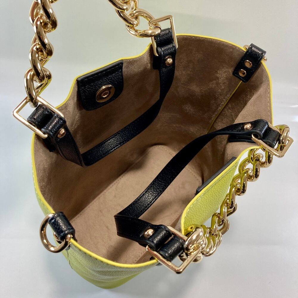 大きめなチェーンのハンドルが、デザインポイント。本体同素材の平ハンドルとの2WAY仕様になります。また斜め掛けできるショルダー付きです。