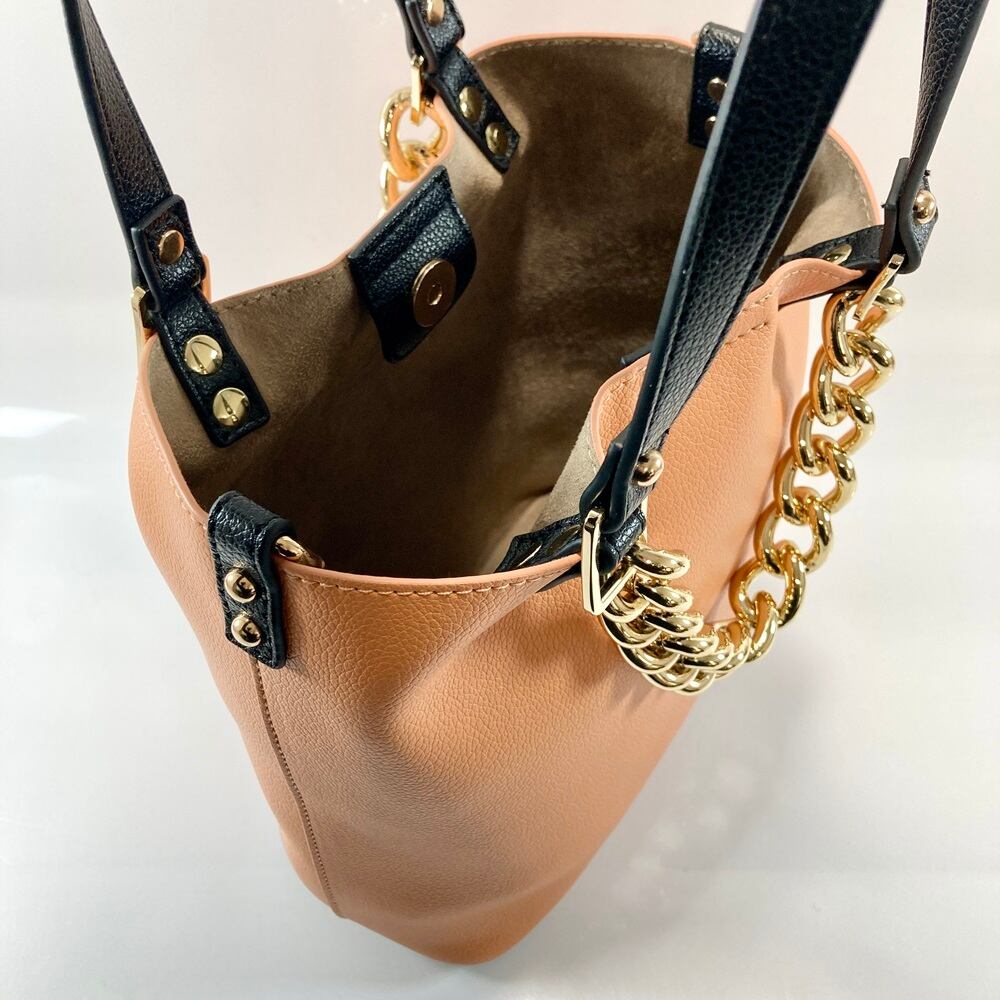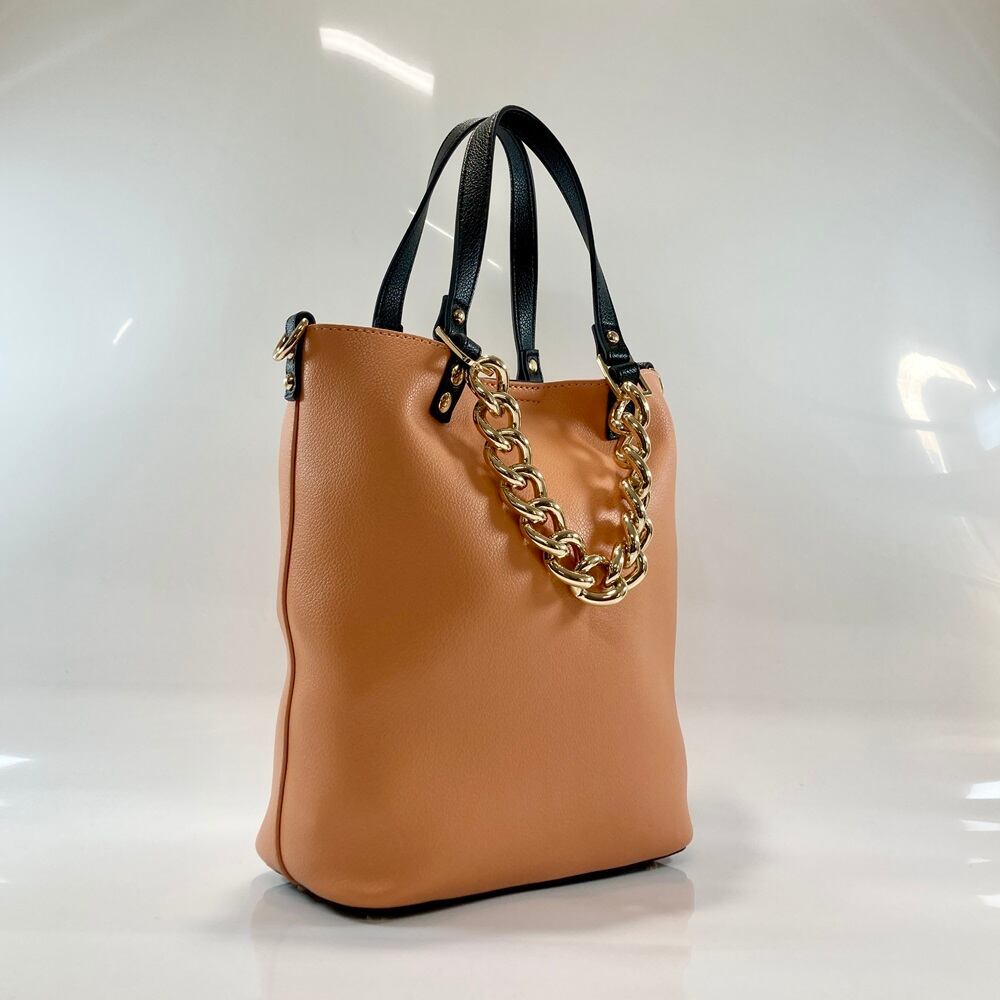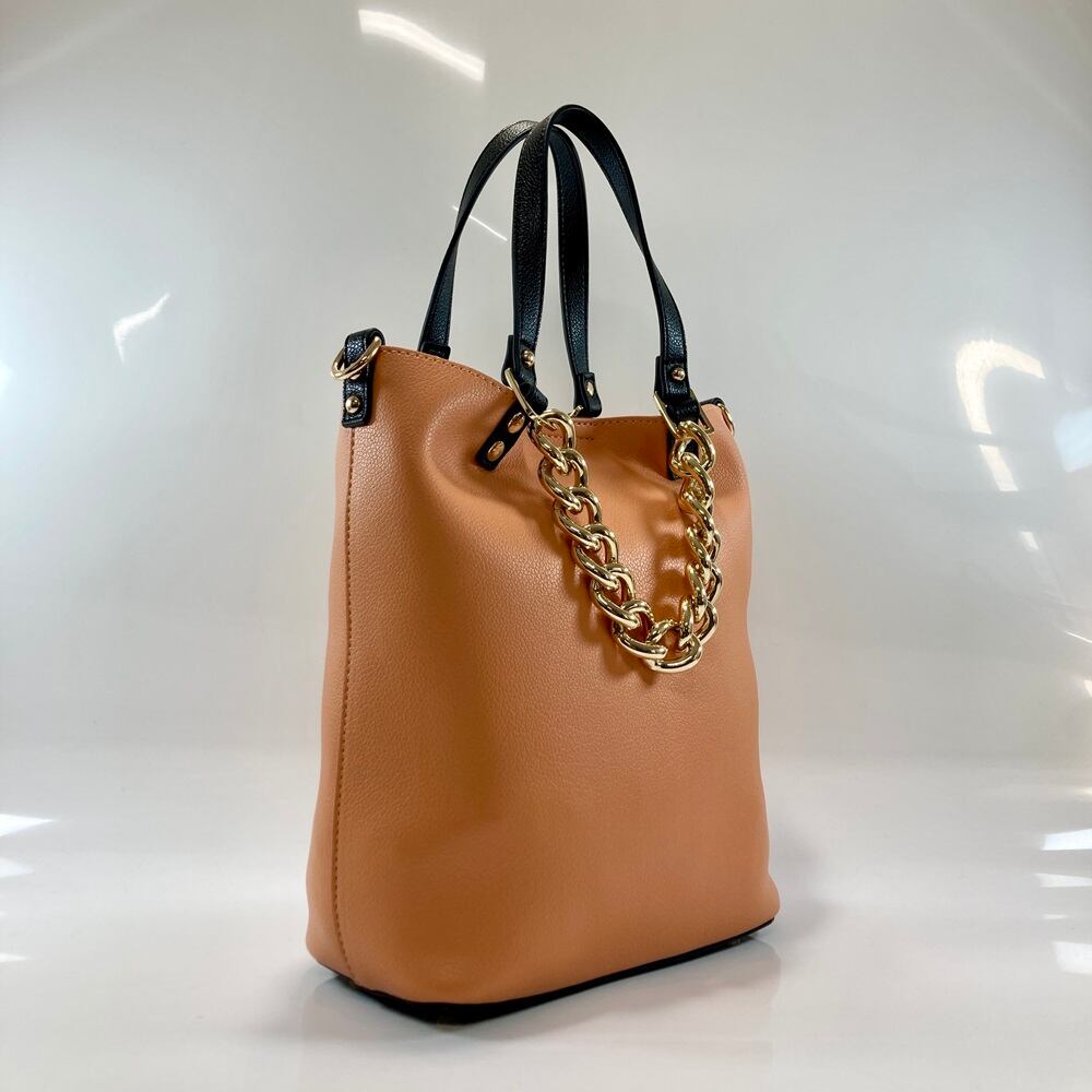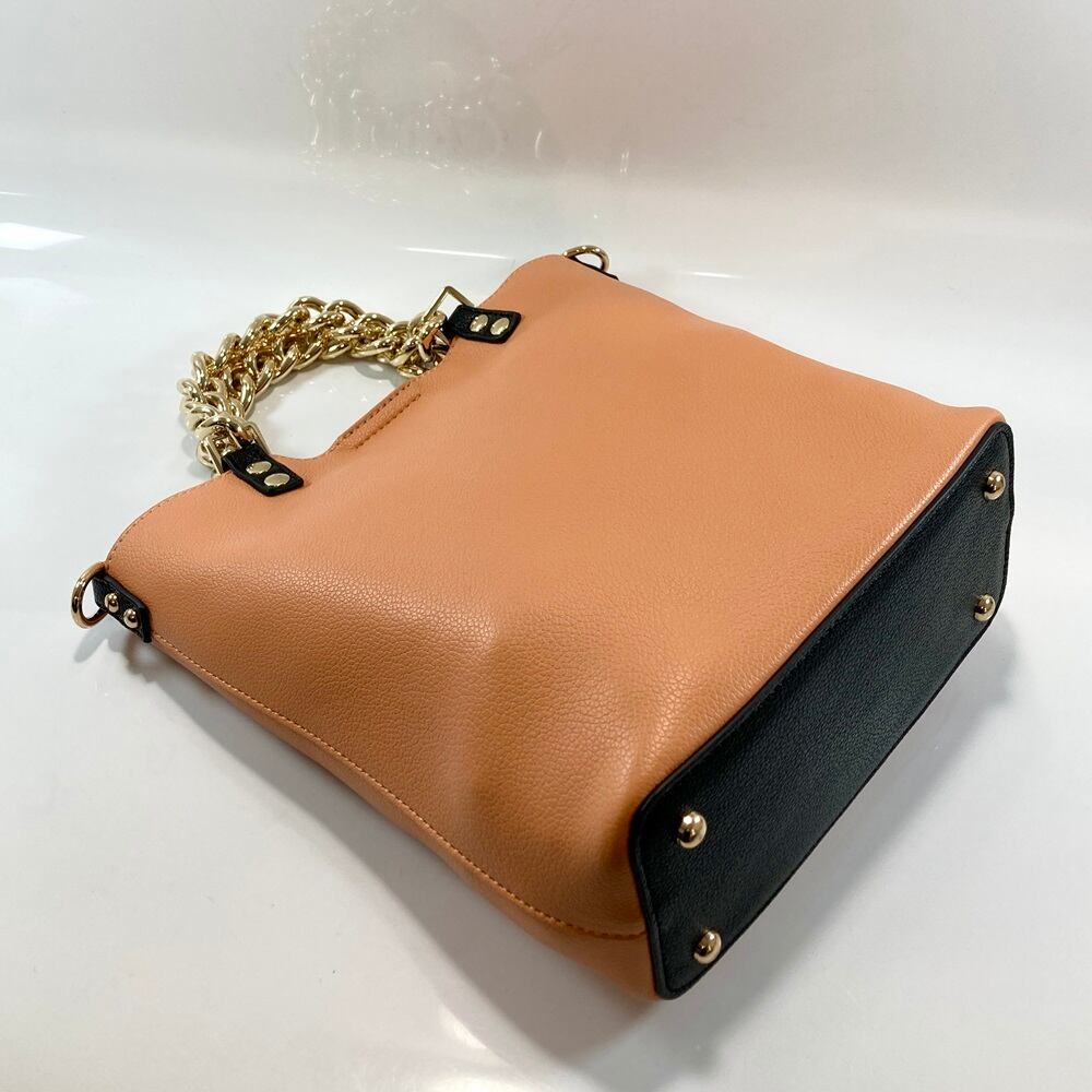 シンプルなデザインで、チェーンハンドルがアクセントになった2WAY仕様のトートバッグ。